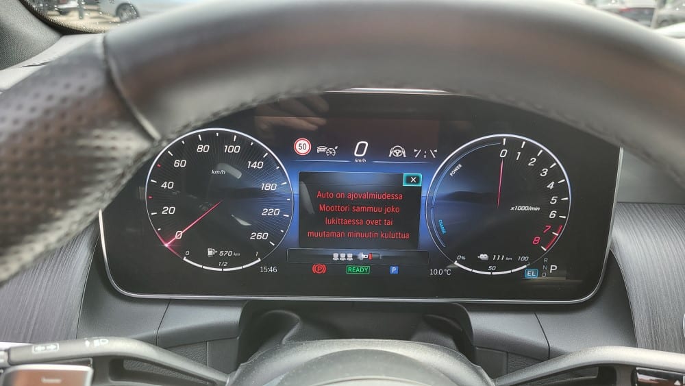 The Mercedes’ ratchet gearbox with its various levers around the steering wheel, housing numerous small switches, also takes some getting used to and for a driver with larger Finnish naked fingers.