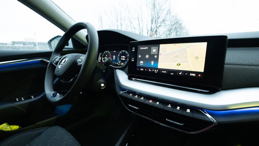 The dashboard is partly upholstered in fabric, in a departure from the mainstream, and features a 10″ touchscreen in the centre with clear functions. The intelligent climate control menu makes it easy to momentarily switch on, for example, leg warming or cooling.