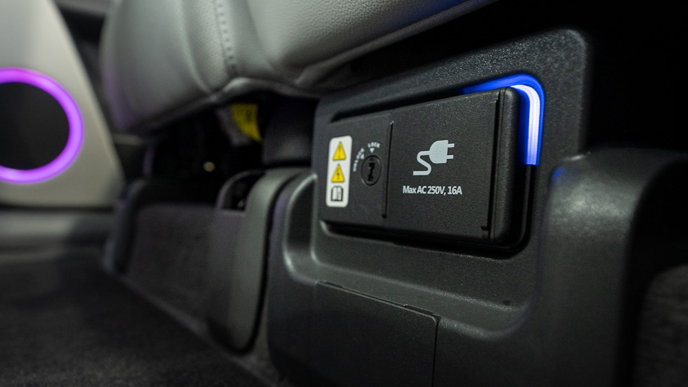 In addition to the 220V socket under the rear seats, the car is also powered from the car’s charging port. Hyundai’s Vehicle-to-Load technology allows up to 3.6 kW of power to be drawn from the car’s charging port. This can be used, for example, to run a small space heater or an electric lawnmower in a cottage without electricity.