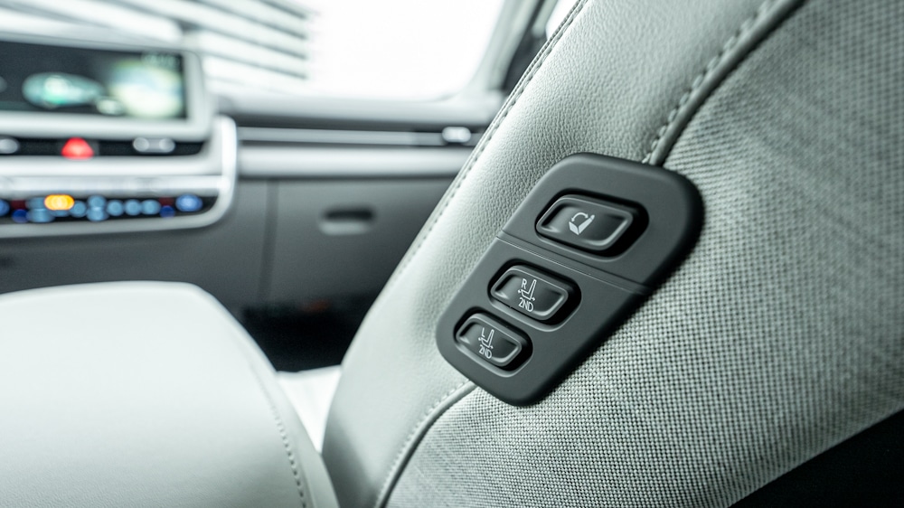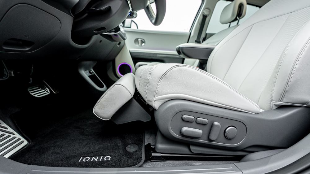 Stepping inside the Ioniq 5, it’s easy to notice the spacious interior space made possible by the car’s exterior dimensions. There’s plenty of space both at the front and the rear. The rear passenger seats are easily adjustable lengthways via buttons on the side of the front seat. There’s no shortage of legroom in the rear, even on the longer thigh.